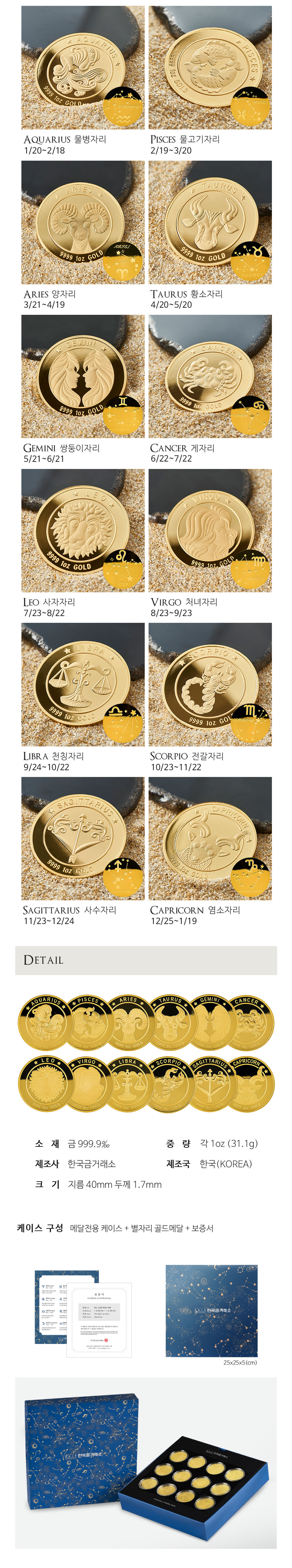 1온스 황도 12성좌 별자리 골드 불리온 메달 세트